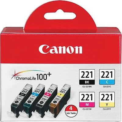 Get vibrant prints that last a long time by using this four-count pack of black and tricolor ink tanks. The ink dries quickly to prevent smudging, smearing and bleeding through papers for clean results every time. These Canon CLI-221 black, cyan, magenta and yellow ink tanks are easy to install into select Canon printers, and the assortment of colors brings out the best in photos, charts and other printouts.