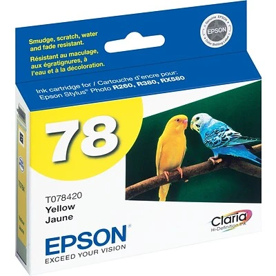 Create prints that are resistant to scratches, water and fading by using this yellow ink cartridge. The ink in this cartridge dries almost instantly, preventing smears and smudges and keeping prints looking clean and neat every time. This Epson 78 yellow ink cartridge is sold individually and is compatible with select Epson photo printers and laser printers for versatility.