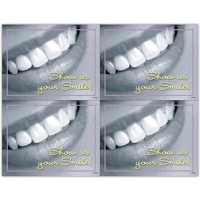 Attention-getting postcard captures your patients attention. The back of the postcard is blank so you can add a personalized message, using your own Laser Printer. Uncoated stock, perforated sheets. Four cards to an 8-1/2″ x 11″ sheet. 100 cards. Detached size: 4-1/4″ x 5-1/2″.