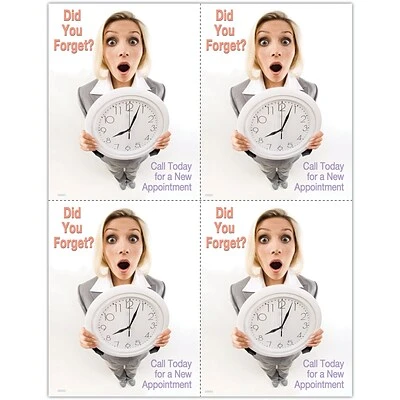 Attention-getting postcard captures your patients attention. The back of the postcard is blank so you can add a personalized message, using your own Laser Printer. Uncoated stock, perforated sheets. Four cards to an 8-1/2″ x 11″ sheet. 100 cards. Detached size: 4-1/4″ x 5-1/2″.