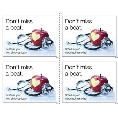 Attention-getting postcard captures your patients attention. The back of the postcard is blank so you can add a personalized message, using your own Laser Printer. Uncoated stock, perforated sheets. Four cards to an 8-1/2″ x 11″ sheet. 100 cards. Detached size: 4-1/4″ x 5-1/2″.