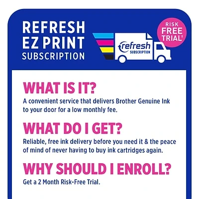 Save up to 50% on toner with Refresh EZ Print Subscription Service. For one low monthly payment, get Brother Genuine Toner delivered right to your door, before you need it. Up to 2 months free trial included.