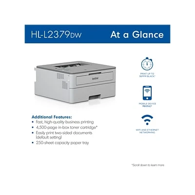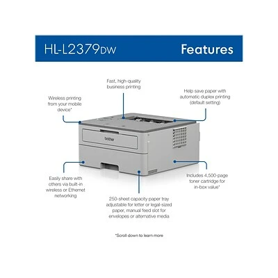 The Brother HL-L2379DW compact monochrome laser printer provides the functionality you need for environments with limited space, including corporate home offices and small offices. This compact and reliable printer helps increase productivity with fast print speeds up to 36 ppm and default automatic duplex (two-sided) printing to help save paper. Offers in-box value with the ability to print up to 4500 pages using the included Brother genuine super high-yield toner cartridge. Equipped with a 250-sheet capacity paper tray that is adjustable for letter- or legal-size paper, so you can spend less time refilling paper trays. The HL-L2379DW also features built-in wireless or Ethernet network interfaces to easily set up and share on your wireless or wired network. Wirelessly print from your desktop, laptop, smartphone, or tablet: perfect for today’s remote workforce.
