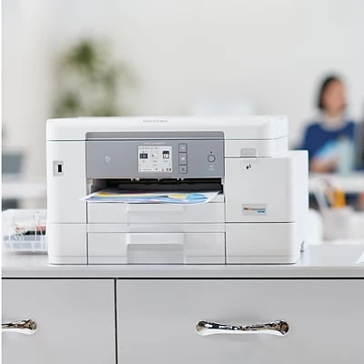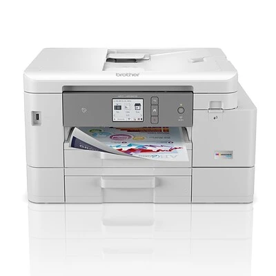 Print, copy, scan, and fax functionality, a generous 2.7″ touchscreen display, and two adjustable paper trays for up to a 400-page total capacity help make the Brother MFC-J4535DW all-in-one color inkjet printer the ultimate INKvestment Tank printer for your home, home office, schoolwork, or small business. Additional paper-handling options include an up to 20-sheet automatic document feeder for fast copying and scanning along with a bypass tray to handle a variety of media. The MFC-J4535DW also offers versatile connection options with NFC touch-to-print, built-in wireless, Wi-Fi Direct, Ethernet, or connect it locally to a single computer via USB interface. The MFC-J4535DW is supported by the Brother Mobile Connect app providing a convenient user interface that enables printing, scanning, copying, and device management from your smartphone or tablet. The MFC-J4535DW features fast print and scan speeds, along with the ability to wirelessly print, copy, and scan, along with duplex printing and enough ink for up to one year of printing with just the ink included in-box.