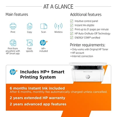 INCLUDES HP+ SMART PRINTING SYSTEM – HP+ makes your printer Smarter with advanced features that make it easy to print from any device or app. This printer only works with Original HP Toner and requires an HP account and internet connection.