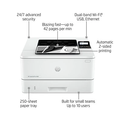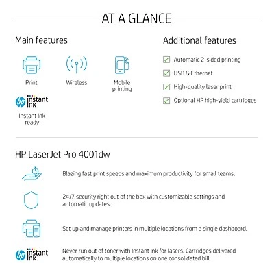 Get ultra-fast speeds and powerful productivity with the LaserJet Pro 4001dw. Get laser quality black & white printing for all your business documents. Set up and manage printers in multiple locations with a single dashboard. Never run out of toner with an optional subscription for Instant Ink for lasers.