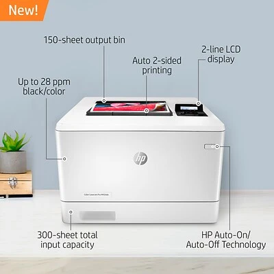The HP Color LaserJet Pro M454 printer is designed to let you focus your time where it’s most effective-helping to grow your business and staying ahead of the competition. The HP Color LaserJet Pro M454 printer is designed to let you focus your time where it’s most effective-helping to grow your business and staying ahead of the competition. Dynamic security enabled printer. Only intended to be used with cartridges using an HP original chip. Cartridges using a non-HP chip may not work, and those that work today may not work in the future. This printer is with automatic 2-sided printing, best-in-class security, and streamlined, sustainable design.Includes: HP Color LaserJet Pro M454dn, 4 preinstalled Introductory HP LaserJet Toner cartridges (Black, Cyan, Magenta, Yellow: 1200 pages), In-box documentation (Getting Started Guide, Install Poster), regulatory flyer