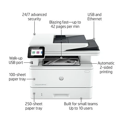 Get ultra-fast speeds and maximum productivity with the multifunction LaserJet Pro 4101fdn. Get laser quality black & white printing for all your business documents. Support your dynamic workteam with this high-speed smart printer, ideal for up to 10 users. Never run out of toner with an optional subscription for Instant Ink for lasers.