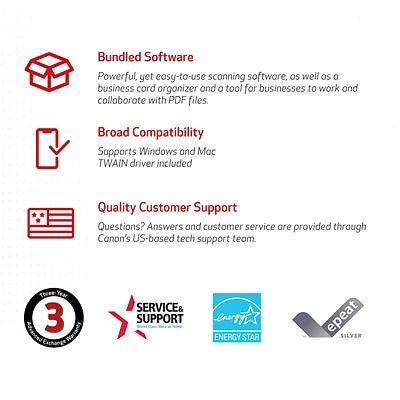 Bundled software: Powerful, yet easy to use scanning software, as well as a business card organizer and a tool for businesses to create, view, edit, convert, and collaborate with PDF files