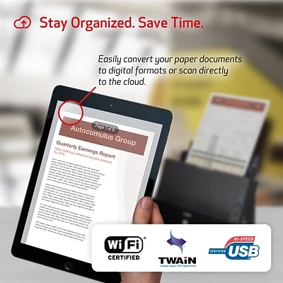 Stay organized: Easily convert your paper documents into digital formats (searchable PDF, JPG, and more) or scan directly to the cloud (Dropbox, Google Drive, OneDrive, Box, QuickBooks Online, Evernote, SharePoint, and more)