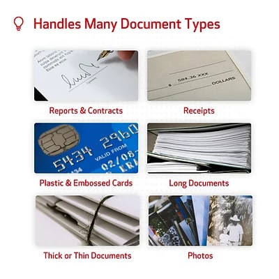 Reliably handles many different document types: Receipts, photos, business cards, plastic or embossed cards, reports, contracts, long documents, thick or thin documents, and more